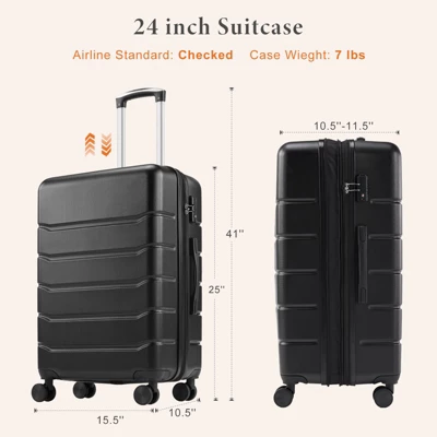 FURNIinspire 24 Inch Luggage Check In Luggage Hard Shell Carryon Suitcase Rolling Travel Luggage Travel Luggage, Black, 10.5″*15.5″*25″