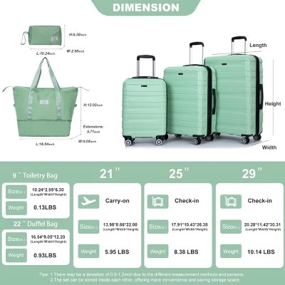 FURNIinspire 5 piece luggage set combines durability with smart expansion features to meet every travel need. The 29 inch case and duffel include an expandable layer that increases capacity by 30 percent, so you can pack extra items without forcing the zipper. Completing the set are a 21 inch carry on, a travel duffel, and a toiletry bag, all fitted with an ergonomic 3 stage handle that adjusts to your preferred height for effortless maneuvering from curb to cabin.