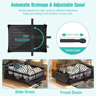 FURNIinspire 2-tier dish drainer blends large capacity with practicality—detachable tiers, a utensil holder, and cup rack accommodate dishes, pots, and mugs. Its auto-draining drainboard with a 360° swivel spout directs water to the sink, avoiding countertop mess. Made of rust-resistant carbon steel, it’s sturdy for long use. Compact enough for countertops, corners, or windowsills, it saves space effortlessly. Tool-free assembly takes just a minute.