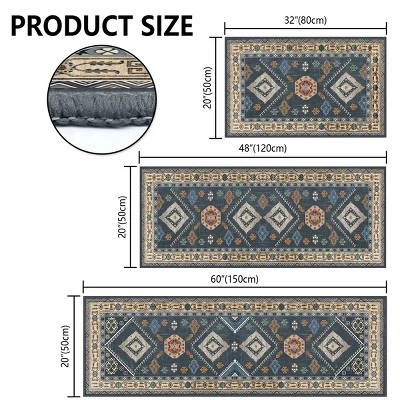 FURNIinspire Floor Mats Home 3 Piece Kitchen Rug Machine Washable Floor Mat For Living Room, Vintage Carpet, Non Slip, Dark Blue, 60″*20″