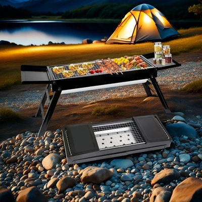 FURNIinspire portable charcoal grill combines smart design with durable performance. The folding mechanism makes it incredibly travel-friendly while the iron construction ensures lasting use. Perfect for everything from quick campsite meals to backyard parties, the convenient charcoal drawer and ventilation system give you complete control over cooking temperatures. The included accessories and side tray keep all grilling essentials organized.