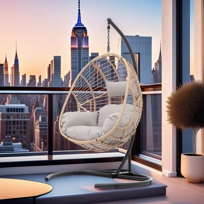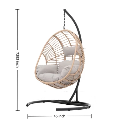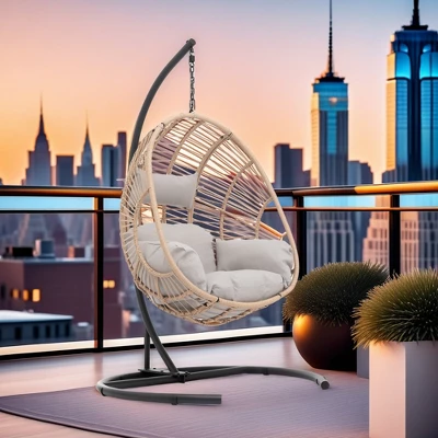 FURNIinspire Patio Swings Wicker Swing Egg Chair With Stand, Outdoor Indoor Hanging Chair With Beige Seat Cushion, Natural Color, 42“*47″*73″