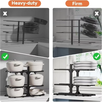 - Thickened Carbon Steel for Heavy-Duty Load-Bearing: This pot and pan organizer is crafted from premium thickened carbon steel with a reinforced base, boasting an impressive total load capacity of 100lbs—each tier alone supports up to 15lbs. It easily holds heavy cookware like cast iron pans, Dutch ovens, and thick ceramic pans without bending or wobbling. The robust material resists deformation and rust, ensuring long-term use in damp kitchen environments. Unlike flimsy racks that sag under weight, it’s a reliable storage solution for even your heaviest kitchen tools.