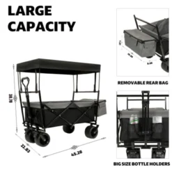 FURNIinspire Outdoor Serving Carts 480Lbs Collapsible Wagon With Canopy Lightweight Foldable Wagon With Mosquito Net, Black, 45.28″*22.83″*38.78″