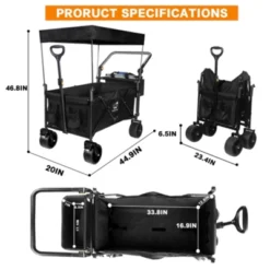 FURNIinspire Outdoor Serving Carts Collapsible Wagon Foldable With Removable Canopy Wheels For All-Terrain Brake For Camping, Black, 35.4″*19.7″*44.5″